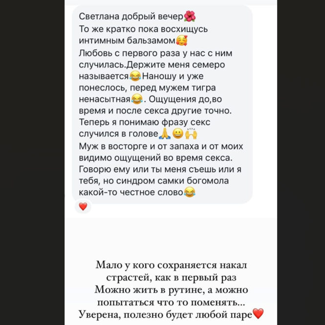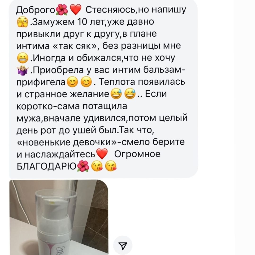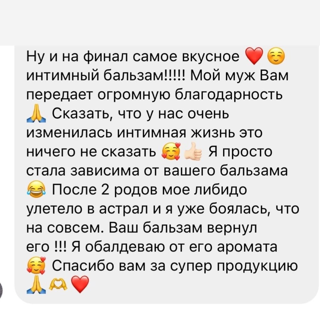 Если вы находитесь в периоде, когда ваши отношения с партнером уже не такие страстные, и желания больше НЕТ, чем есть, то использование этого бальзама в корне может поменять ситуацию (о чем свидетельствуют многочисленные отзывы). Ну, или, если у вас все хорошо, то бальзам внесет еще более яркие краски в вашу интимную жизнь.