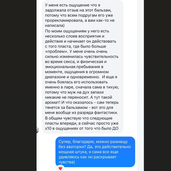 Психологически: аромат бальзама позволяет расслабиться и переключиться на интимные отношения. Повышает желание, интимная близость происходит чаще, оргазмы становятся регулярнее и сильнее.