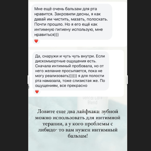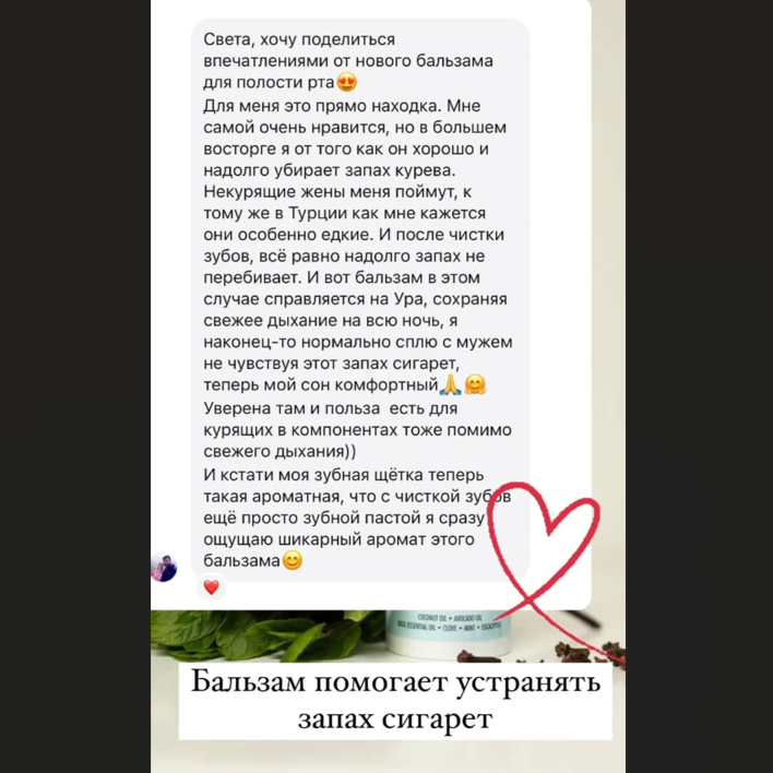 Эффект увеличится многократно, если для этой процедуры используется смесь масел с эфирными маслами. И для этого в моей линейке есть идеальнейшее средство- это бальзам для полости рта. Состав бальзама натуральный, масляной, полный перечень, какие масла входят в его состав и их свойства можно почитать на сайте подробно.