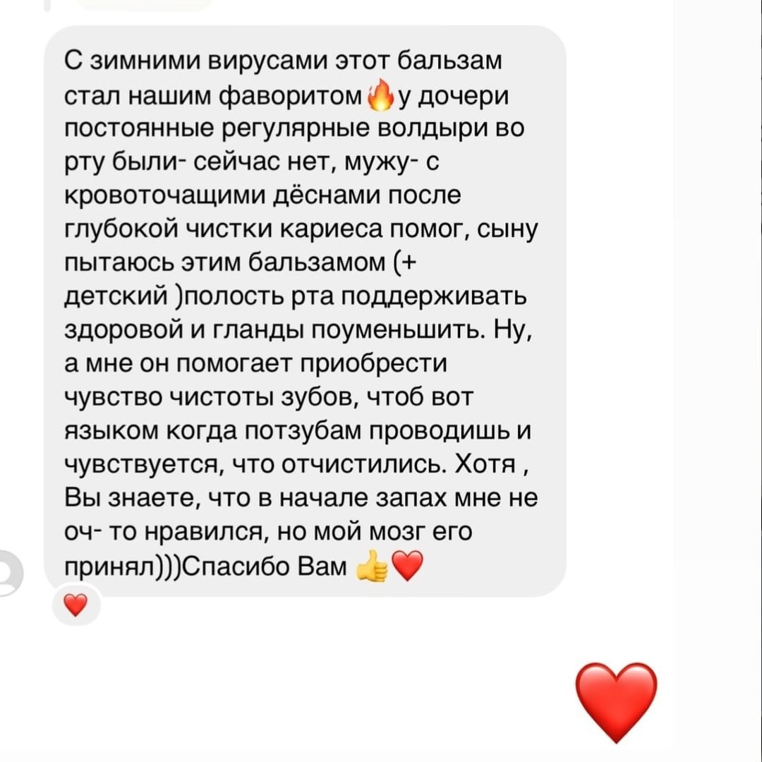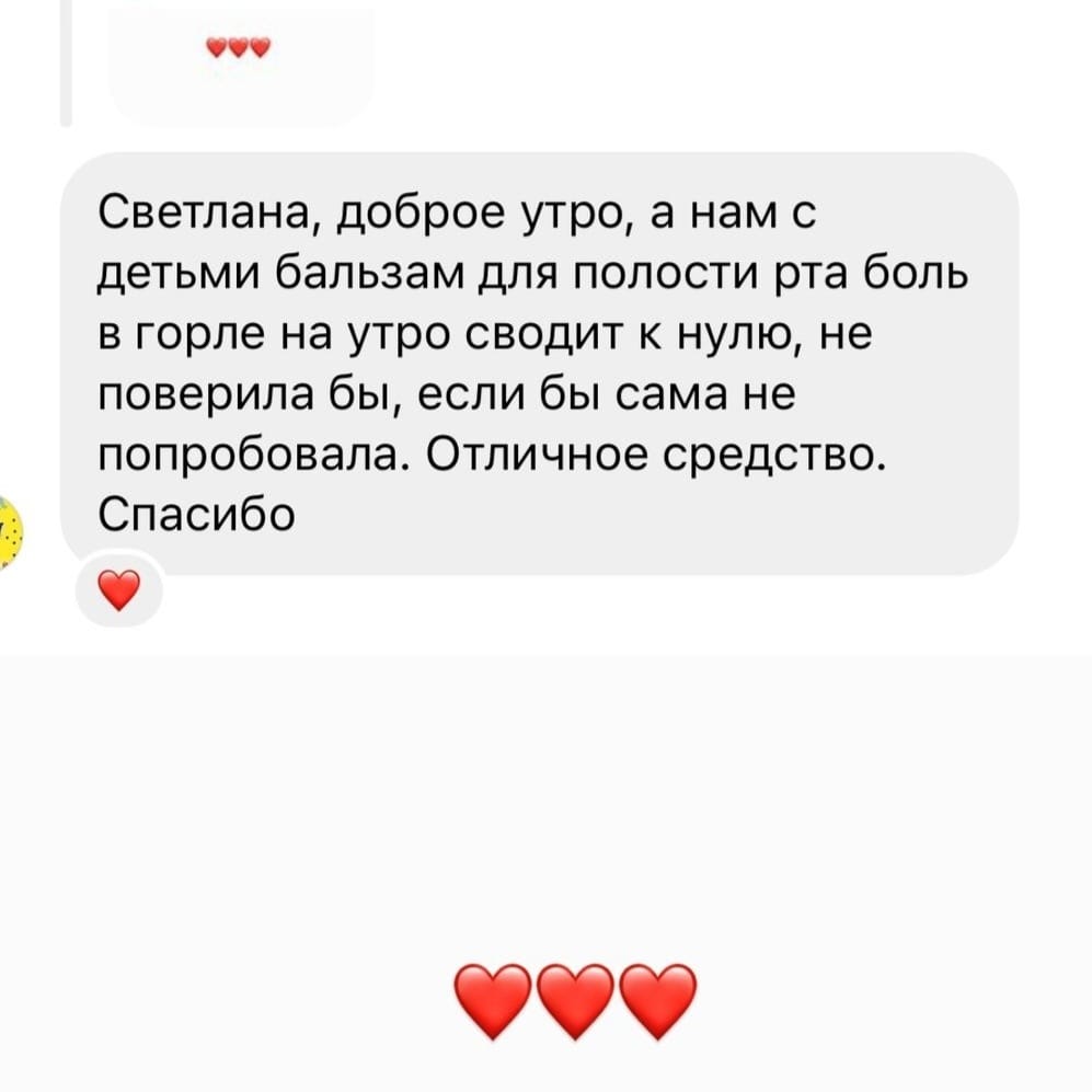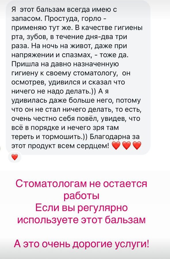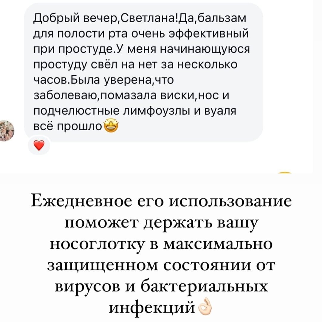 Если у вас заболело горло, то дополнительное применение бальзама несколько раз в день может предупредить развитие ангины и снять боль. Так же будет оказывать профилактическое воздействие против ОРВИ и других вирусных и инфекционных заболеваний, передающихся через слизистые носа и горла. Были отзывы о положительном эффекте бальзама при аллергическом кашле. Так же значительно ускоряет все процессы заживления, оказывает противовоспалительный и антибактериальный эффект в период стоматологического лечения.