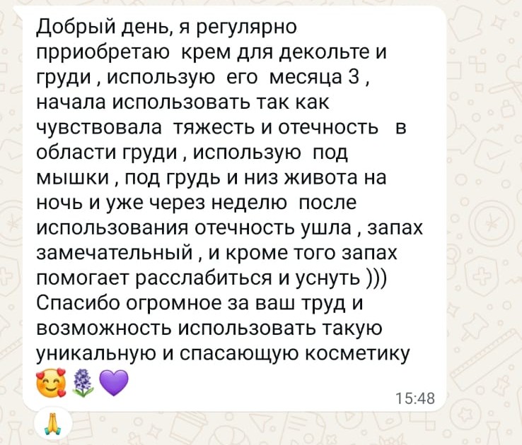 Этот ароматный крем с лимфодренажным эффектом — отличное средство для ухода за кожей груди, живота и подмышек. Он помогает не только улучшить внешний вид и контуры тела, но и поддерживает гормональный баланс, обладает противораковым эффектом и расслабляющим действием, что делает его идеальным для вечернего ухода.