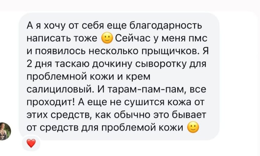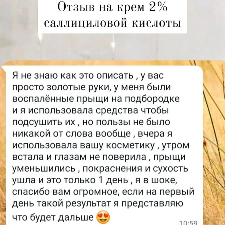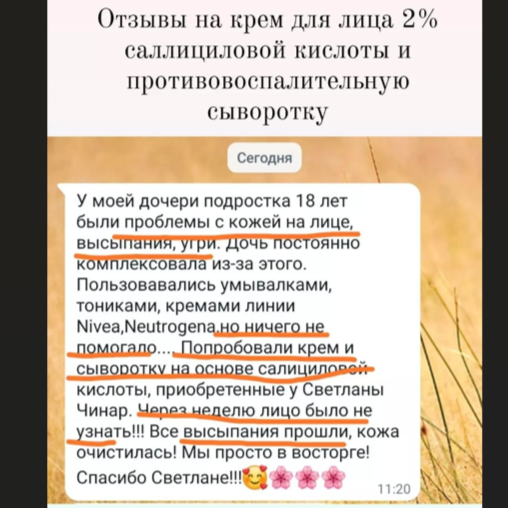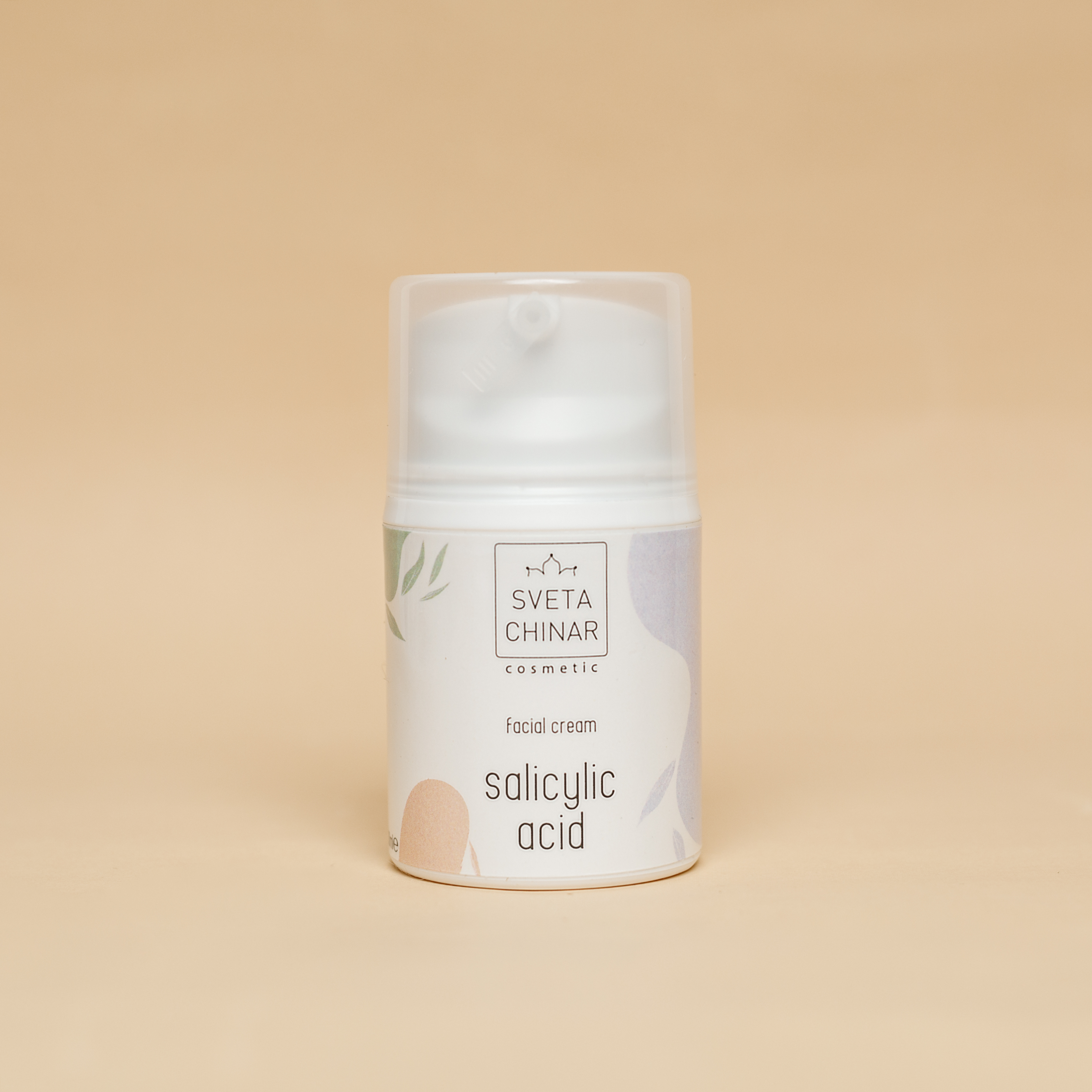 3. Крем с салициловой кислотой с содержанием 2% салициловой кислоты и азелаиновой кислотой; мягко отшелушивают, уменьшают воспаления и способствуют выравниванию тона.Также содержит колоссальный противовоспалительный комплекс натуральных компонентов. Основа натуральный гидролат лаванды. Благодаря выстроенной косметической системе компонентов, эффективность салициловой кислоты в 28 раз превосходит эффективность в обычном креме. Успокаивает, питает, увлажняет. Содержит комплекс витавинов,экстратов. Не забивает поры. Очень лёгкий.