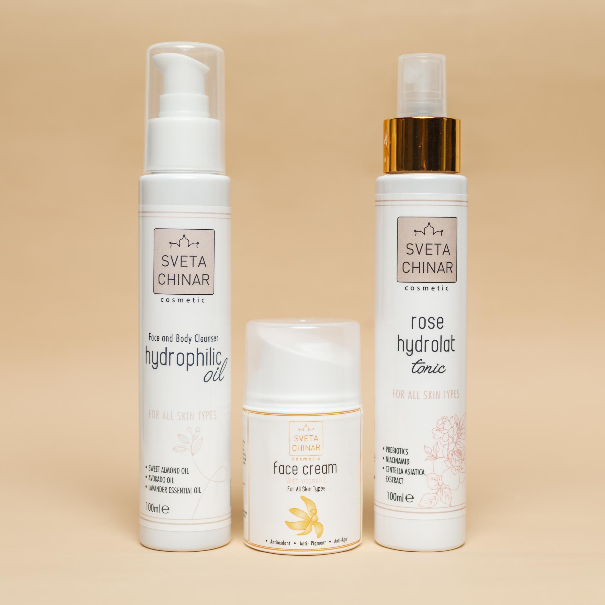 Состав: гидрофильное масло 110 мл, розовый тоник 110 мл, крем с витамином С 30 мл.